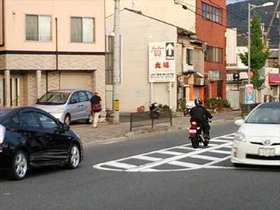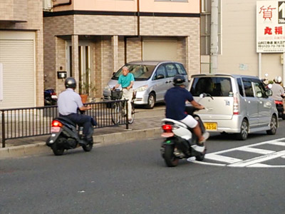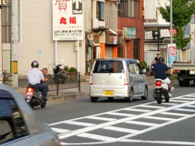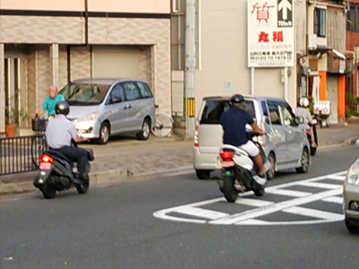 (↓)しばらく観察していたら いくらでも出てくる、センターゼブラを通行して車を抜いていくバイクが。