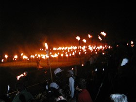 | 沿道にはたいまつが並び、広河原の集落全体がお祭りムードです。 屋台とかは出てませんが。こんな山奥までテキ屋がわざわざ来るわけが無いか(笑)。 |