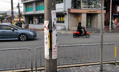 右側の商業施設から出てきたバイクが、そのまま歩道を走って右折していくのがいるんですよ。