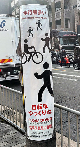この写真の真左に商業施設があるので自転車が行き交いますからね〜。両者共存でお願いします、と。