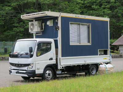 どういうものかというと、2トンの箱車の「箱」の部分をオフィス&プライベート空間に改造し、