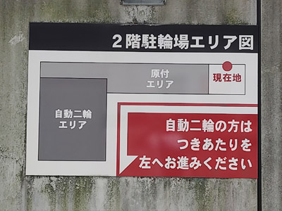 下の写真は、赤と青の背景でそれぞれ別の駐輪場です。