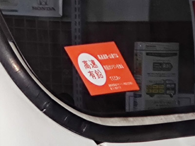 リアウィンドーの左隅に貼られたオレンジ色のステッカーです。