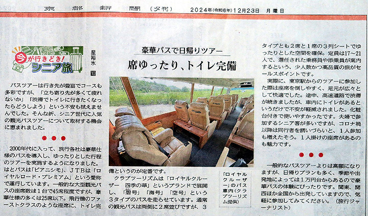 バスツアーのお値段も頃合いのようですし、2+1の3列シートなのも一人旅にも向いてますね。