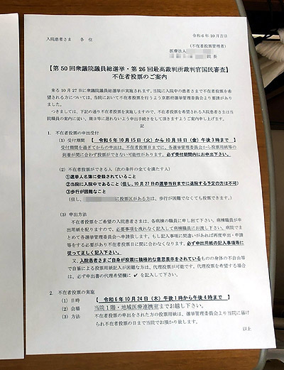 「投票所」には立会人として病院の事務員さんがおられ、自宅に郵送される投票券はもちろんありませんので、